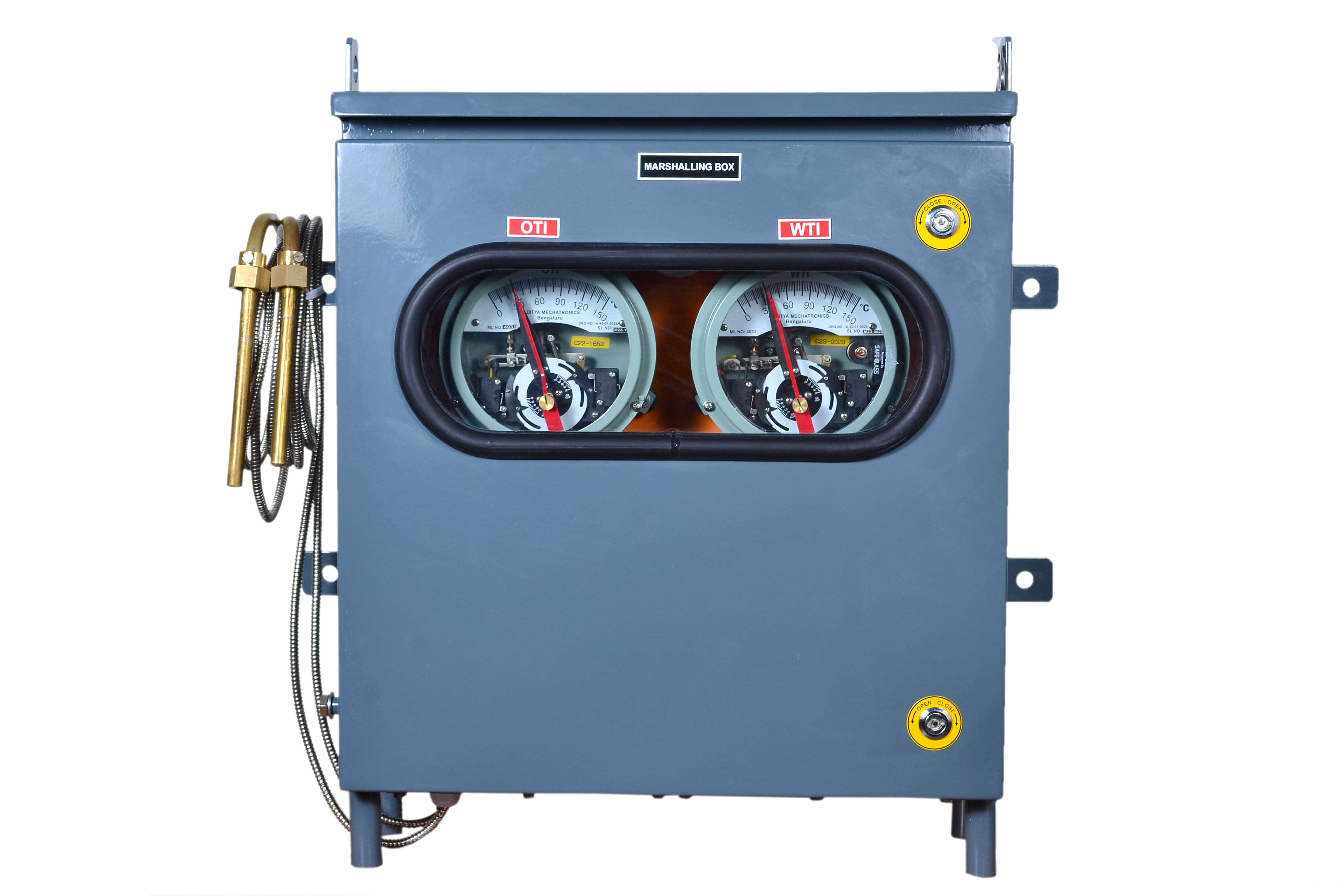 The marshalling box / FCC is a local controlling unit mounted near the Transformer. All types of transformer protection accessories like winding & oil temperature indicators and other necessary components are assembled and wired up into this marshalling box. For remote monitoring of these instruments, their potential free contacts are wired up to the RTCC panel or the incomer panel through multi core cables. These panels can be of standalone or tank mounted type. We have tested our standard Marshalling Box design for IP-55 at NABL Certified Laboratory, Mumbai. All necessary components used in the panel are of reputed makes with high quality.